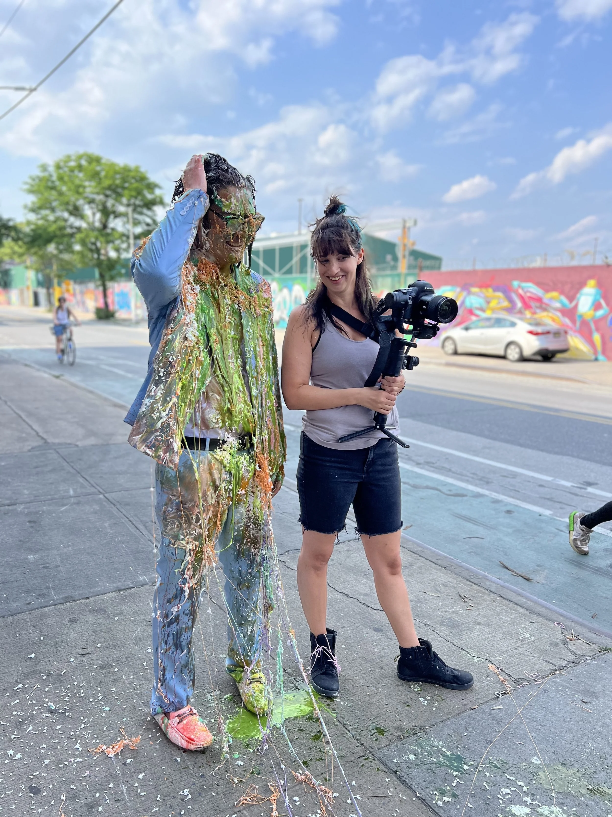 Production wise this was a huge under taking, we had a micro-budget of $1200. We had a tons of props, and 13 extras. My background in dance, anchored me to direct this delicate choreography between camera, extras, backwards walking and garbage- all while holding the camera. The timing was key, and we only had one take to mess up the suit. We did 12 rehearsals before rolling, and that preparedness made for smooth sailing.